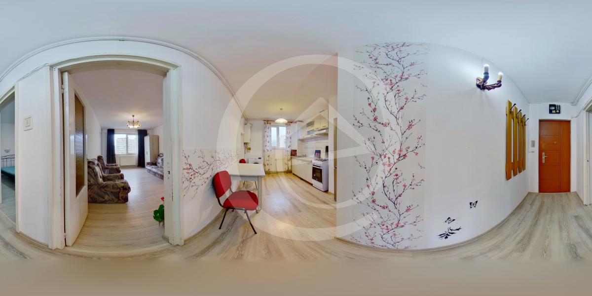 Proprietatea se desfasoara intr-o configuratie decomandata pe 70 mp utili, avand, actualmente, urmatoarea compozitie: bucatarie spatioasa, complet echipata, amintind de finetea florilor de cires, doua dormitoare prevazute cu paturi duble, sufragerie cu canapea, avand acces in balconul inchis, si baie cu cada. Structura apartamentului il recomanda pe segmentul rezidential atat pentru o familie cu copii, cat si pentru prieteni ori colegi, accesul in fiecare din cele trei camere si baie facandu-se prin holuri.