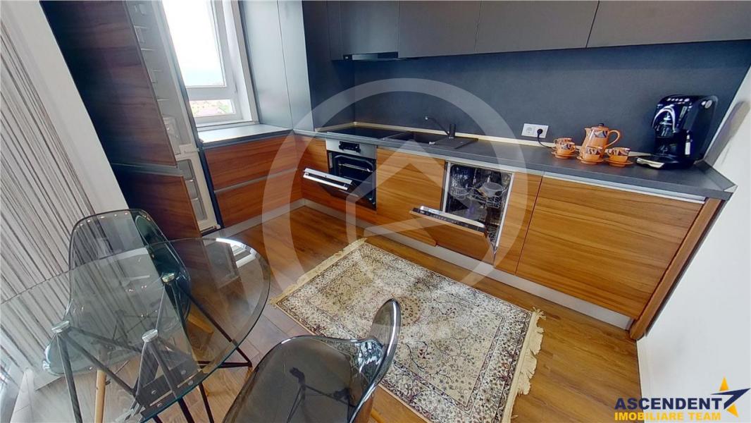 Imobilul se afla la prima inchiriere si este dotat cu tot confortul necesar avand livingul open space cu bucatarie care este dotata si utilata cu aragaz. cuptor,masina de spalat vase, masina de spalat rufe,dormitrul este mobilat cu Mobexpert, baia este gandita sa ofere tot confortul necesar din zona de dus creata din gresie tip mozaic.