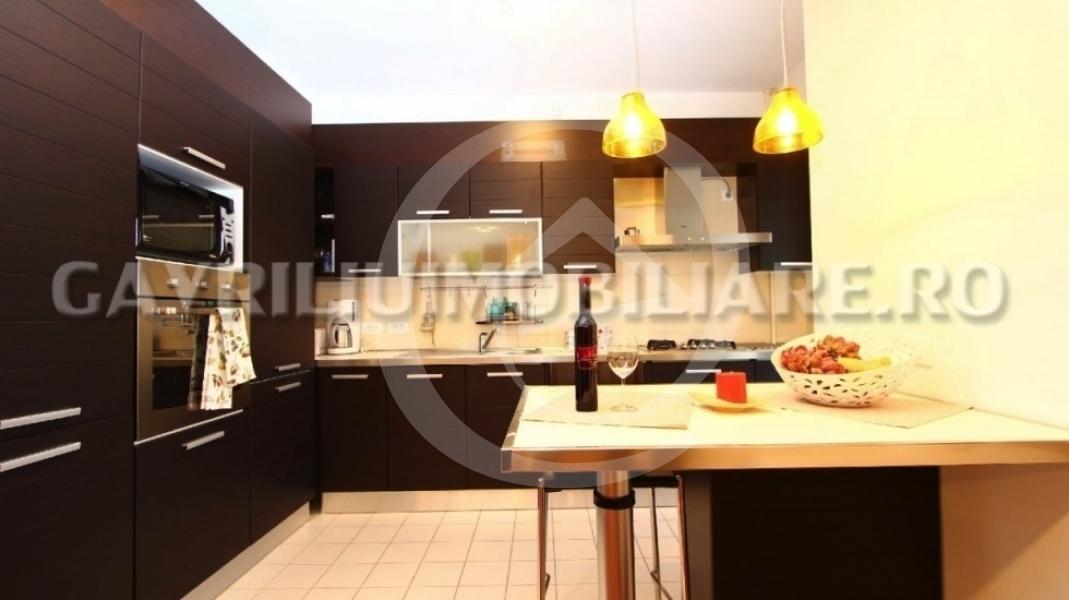 Bucataria a carei mobilier este de culoare wenge se evidentiaza prin liniile moderne si electrocasnicele de calitate. Aceasta este dotata inclusiv cu cuptor cu microunde si masina de spalat vase. Nivelul de utilare al bucatariei include setul complet de vesela si tacamuri.