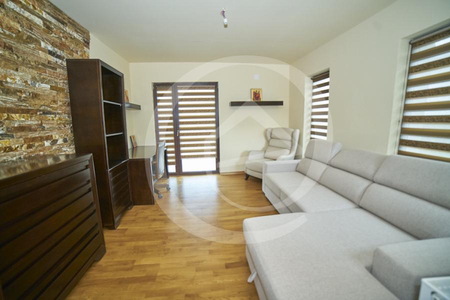 Nota dormitorului de la parter, unde gasiti acel colt de relaxare, este data de un sofisticat birou din lemn masiv, care are iesire pe terasa din spatele casei.