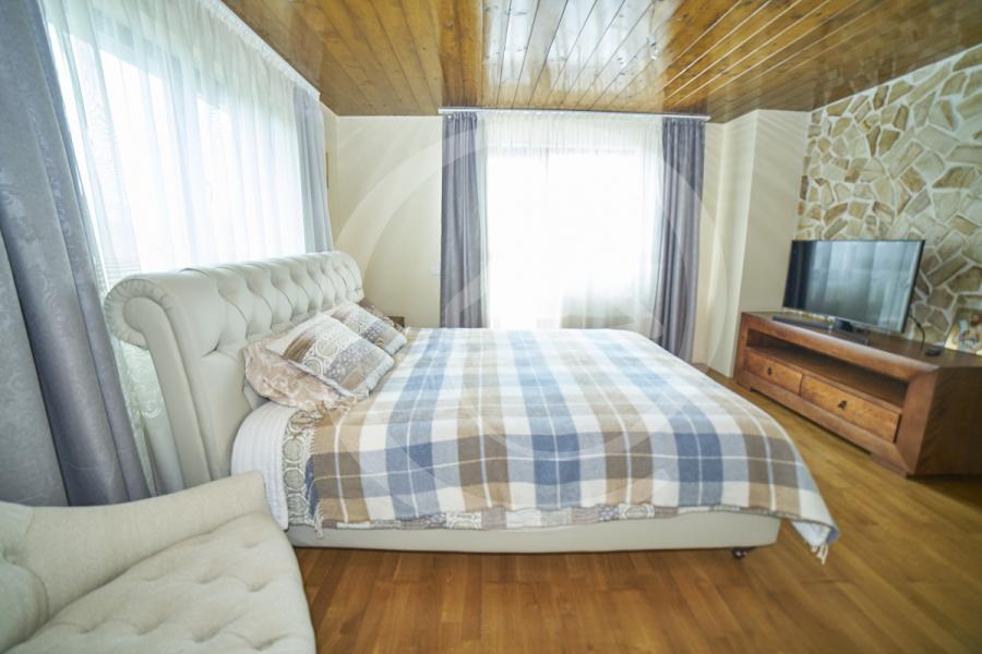 Nota dormitorului de la parter, unde gasiti acel colt de relaxare, este data de un sofisticat birou din lemn masiv, care are iesire pe terasa din spatele casei.