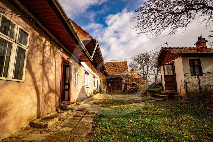 Traditionala casa este in imbratisarea a 680 mp de teren si se desfasoara, prietenoasa. pe urmatoarea compozitie: cinci camere, bucatarie, baie, camara si o bucatarie de vara separata de corpul principal al casei.